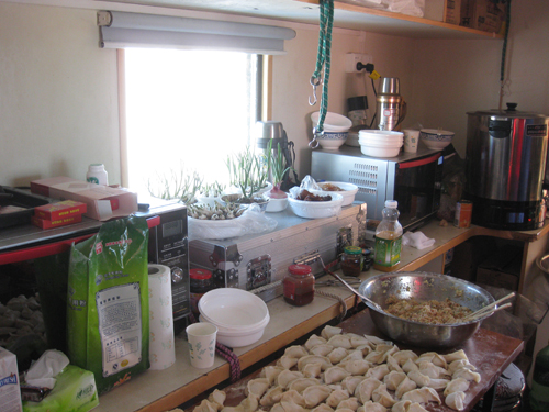 过年包饺子,生活仓内的温暖如春与仓外的冰天雪地是天壤之别,窗台上的蒜苗生机盎然