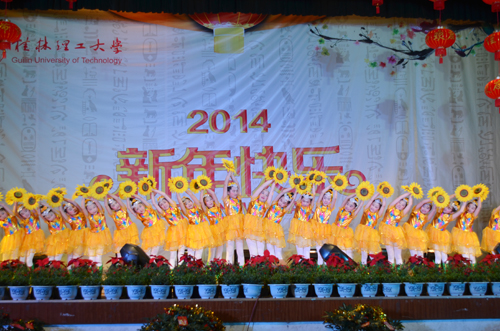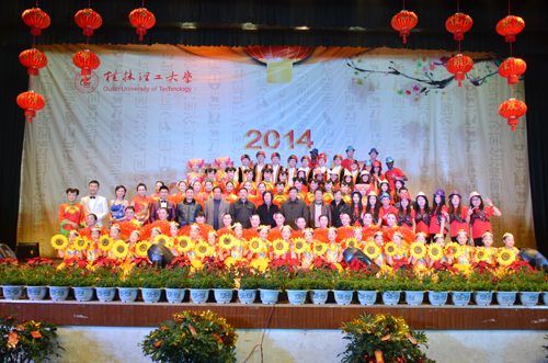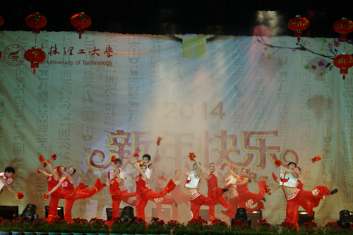 凯歌高奏辞旧岁,激情满怀迎新年。带着辞旧迎新的美好愿景,beat365英国官方网站2014年元旦文艺联欢晚会于2013年12月30日在屏风校区体育馆隆重举行。学校党委副书记、工会主席王赣华,学校党委副书记、纪委书记陈贵英,副校长陈学军、刘宝臣、梁福沛,正厅级调研员张鹏,桂林市总工会党组成员、市教育工会主席王光金等出席晚会,与全校师生一起欢聚一堂,共同庆祝新的一年的到来。 受张学洪书记、解庆林校长委托,王赣华副书记代表学校党委和行政在晚会上致辞,向兢兢业业、任劳任怨工作在各个岗位上的教职员工,向勤奋好学、朝气蓬勃的同学们,向一直关心、支持学校建设发展的离退休老同志们致以诚挚的敬意、良好的祝愿和新年的问候!在致辞中,王副书记还对即将过去的一年进行了回顾:2013年,学校正式获批为博士学位授权单位,党的十八大、十八届三中全会和群众路线教育实践活动深入开展,教学、科研、人才培养、人才队伍建设成绩喜人,民生建设持续改善,校园综合建设水平稳步提高……特色鲜明高水平理工大学的各项建设事业迈上新台阶,留下了一串串坚实的脚印,取得了一个个引人瞩目的成绩,每一个桂工人无不为之自豪,为之欢欣鼓舞。 晚会节目丰富多彩、异彩纷呈,由校大学生艺术团带来的舞蹈《红红火火中国年》热情洋溢,祝福学校红红火火,蒸蒸日上;男声独唱《龙的传人》、男声三重唱《海港之夜》、配乐诗朗诵《祖国——母语》、歌伴舞《乡音乡情》《微山湖》表达了中国心、华夏情、民族魂。舞蹈《迎亲》、服装秀《南岭民族花》则带来了浓郁的壮乡风情。特别是桂林市总工会职工艺术团的彩调表演唱《王三打鸟》在极具特色的地方戏曲中宣传了生态观念和环保理念。舞蹈《春满人间》、《红红的日子》、《花儿朵朵向阳开》、《dance together》则在欢快的旋律中迎接新年的到来。晚会高潮迭起,赢得了在场观众的好评,充分彰显了beat365师生员工积极向上的精神风貌。 新的一年承载新的希望,新的一年憧憬新的梦想,致敬2013,追梦2014,让我们带着对新年的美好憧憬,携手同行,祝愿beat365英国官方网站明天更美好!