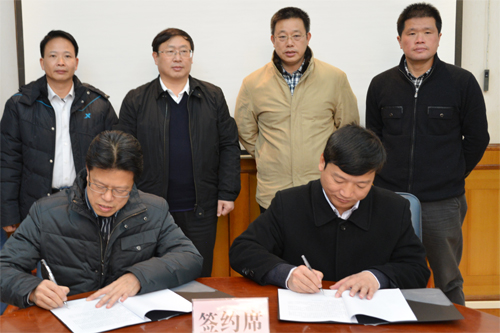 解庆林校长(右一)与百色学院校长唐拥军(左一)签订对口帮扶合作协议