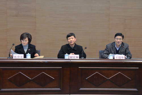 校长解庆林(中)作专题报告,校党委副书记王赣华(右)主持学习会,校党委副书记、纪委书记陈贵英(左)作反腐倡廉形势报告。