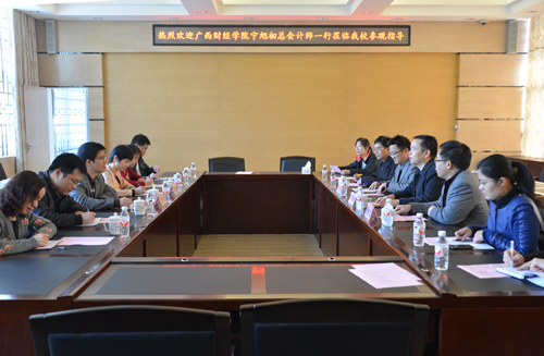 11月21日上午,广西财经学院总会计师宁旭初率该校财务处相关人员一行六人来beat365访问考察。beat365肖岳峰副校长、财务处和后勤集团等相关部门负责人热情接待了来访客人,双方在屏风校区教十楼三楼会议室进行了友好会谈。 座谈会上,肖岳峰副校长向宁旭初总会计师一行详细介绍了beat365的办学条件、财务制度以及后勤管理情况。财务处负责人就beat365财务处科室设置及岗位分工、财务报账审批权限与程序、财务信息化建设情况、多校区管理模式下财务管理等情况做了介绍。双方还就共同面对的多校区管理问题、后勤财务管理问题、科研经费管理及盘活学校资产等问题进行了深入交流。