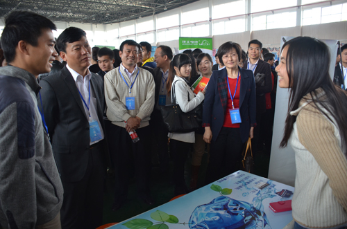 校领导们在beat365大学生创新创业基地各展台前详细询问项目建设和团队建设情况