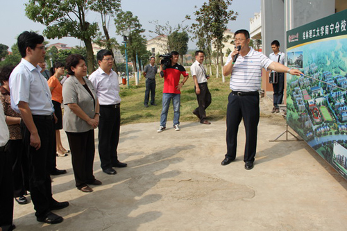 学校党委张学洪书记向李康副主席(左二)等介绍空港校区建设发展情况