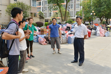 解庆林校长(右一)在屏风校区检查指导学生新学期搬迁工作并与学生亲切交流