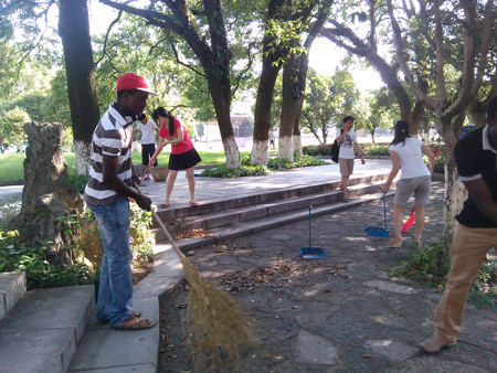 留学生也积极参与校园环境卫生清理