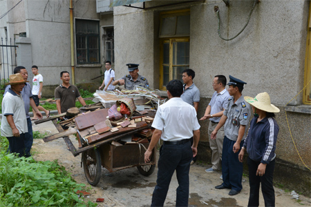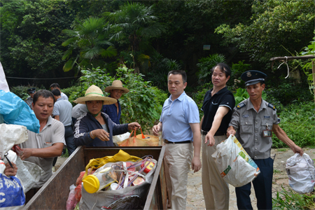 检查组成员与相关部门工作人员一起清理屏风校区垃圾