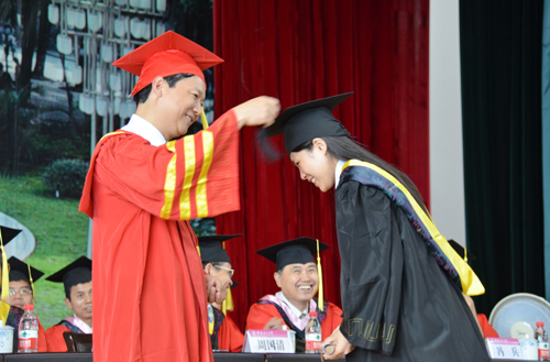 学位评定委员会主席、学校校长解庆林教授为2013届毕业生代表颁发学位证书、拨正流苏并一一合影