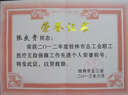 张良贵同志荣获2012年度桂林市总工会职工医疗互助保障工作先进个人荣誉称号