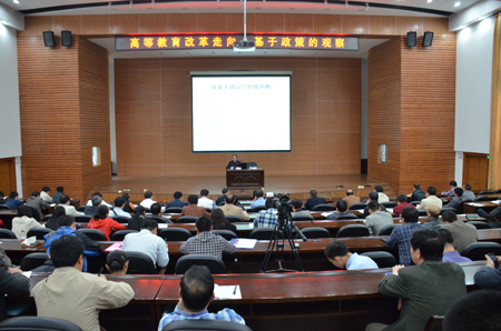 党的十八大站在我国教育改革发展新起点上,面对由高等教育大国迈向高等教育强国的新形势,提出要切实推动高等教育内涵式发展的要求,围绕高校如何在党的十八大精神指引下推动内涵发展,广西师范大学高金岭教授在4月27日下午图书馆报告厅举行的处级领导干部学习贯彻党的十八大精神培训班和中青年干部培训班上作题为“高等教育改革走向:基于政策的观察”的专题报告会,就此问题从政策层面给予解读。正厅级调研员张鹏主持报告会。 从政策分析样本到政策关键词与价值判断,从高等教育的功能界定到使命与任务,从规模扩张外延发展的现象描述到质量提升内涵发展原因分析,从国家层面的知识、能力、素质并重,宽专交和精深通并行的卓越计划和高等学校创新能力提升计划到自治区层面的全面振兴广西高等教育的分类指导,高金岭教授围绕高等教育的大众化、内涵发展、质量提升、特色发展、协同创新、协调发展、分类评估、综合改革、教育公平等问题进行了系统阐述,佐以大量的样本、数据、图表、案例等加以论证,并给出了具体的途径与对策。最后,高金岭教授还就自己针对《国家中长期教育改革和发展规划纲要(2010-2020年)》的教育杂谈与在座人员进行了分享。