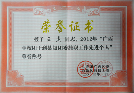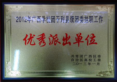 beat365被评为“2012年广西学校团干到县级团委挂职工作优秀派出单位”