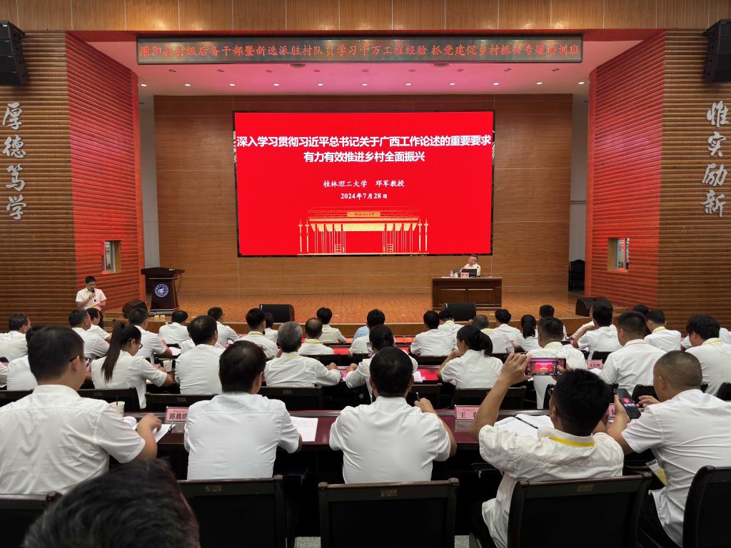 学校紧紧围绕“学习千万工程经验 抓党建促乡村振兴”主题为培训班精心设计课程。在培训首场报告会上,学校党委书记邓军以“深入学习贯彻习近平总书记关于广西工作论述的重要要求,有力有效推进乡村全面振兴”为题,从深入学习习近平总书记关于广西工作论述的重要要求出发,为培训班学员深入解读了乡村振兴战略蕴藏的逻辑内涵和实践要求,勉励全体学员以习近平新时代中国特色社会主义思想为指导,在推动乡村振兴发展、奋力推动灌阳县高质量发展、努力谱写中国式现代化广西篇章上走在前、当先锋、作表率,展现党员干部更大的担当作为。桂林市委党建办、农业农村局、市委党校和灌阳县相关单位负责人分别讲授了《村集体经济发展案例》《健全乡村治理体系 助力乡村全面振兴》《中国式现代化背景下的三农工作》《基层党支部工作实务培训》《〈中国共产党纪律处分条例〉解读》《学习借鉴“千万工程”经验,推进乡村全面振兴》等理论与业务实操相结合的专题课程,为村级后备干部暨新选派驻村队员学习运用“千万工程”经验,抓党建促乡村全面振兴工作奠定了扎实的理论基础、锤炼过硬的实战能力。