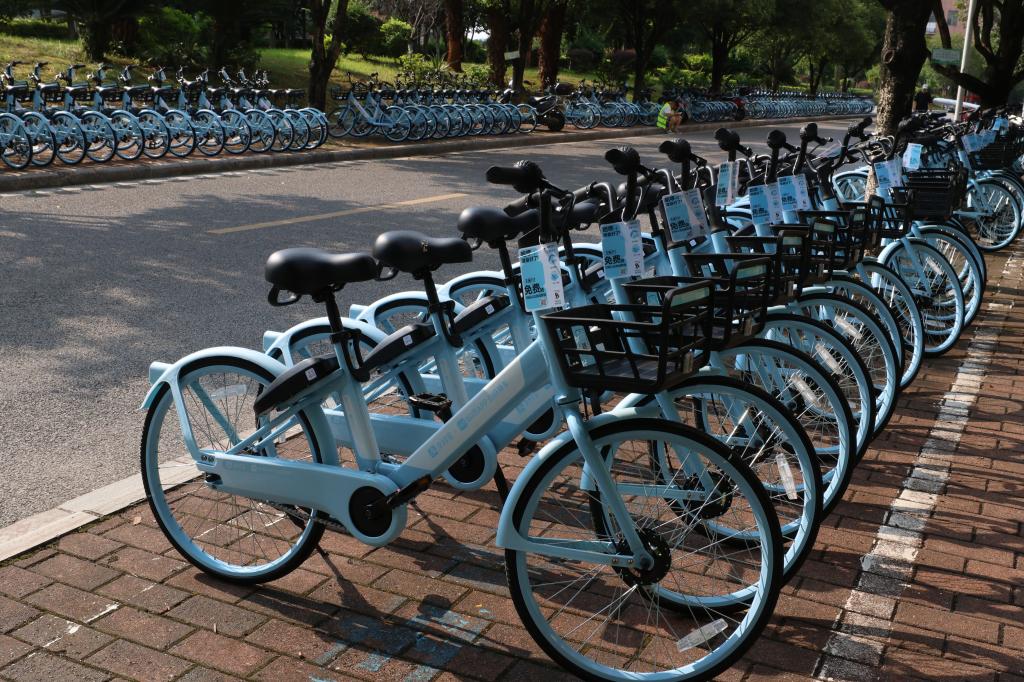 摆放整齐的共享自行车