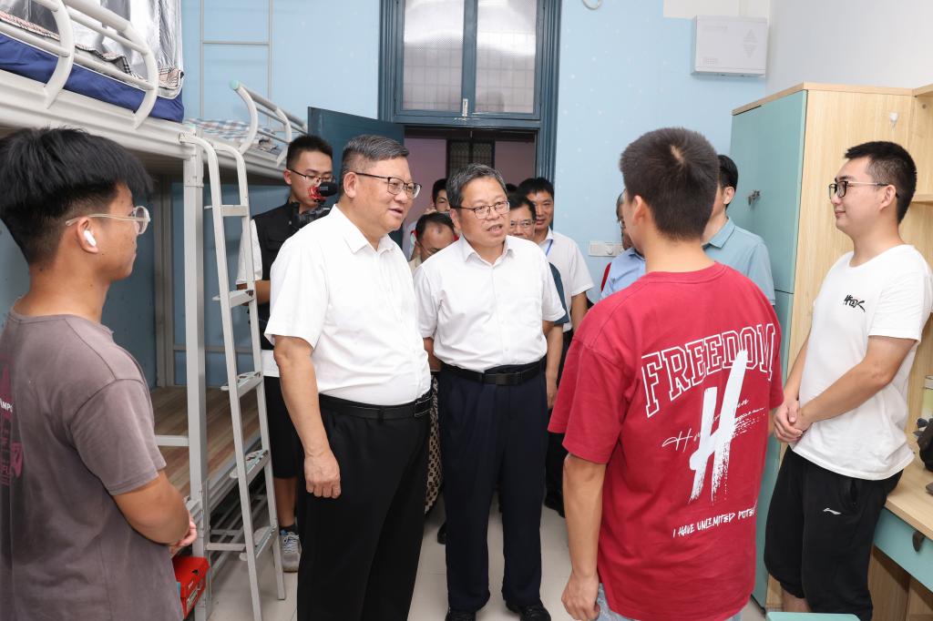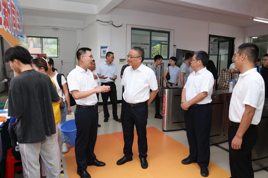 秋日序章,迎新启航。beat365英国官方网站2024级新生迎着骄阳、怀揣梦想,从五湖四海汇聚桂工,携手开启筑梦桂工的全新旅程。9月8日,学校党委书记邓军,党委副书记、校长王敦球,党委副书记吴志强,副校长周国清,党委常委、副校长王磊,党委常委、副校长黎贞崇分别在雁山、屏风两校区现场检查指导迎新工作,依次走访两校区大门口、各学院迎新接待点、学生宿舍、绿色通道等地,详细查看迎新保障及各迎新点布置情况,了解新生数据、报到情况,并看望慰问2024级新生代表。校长助理张成龙,相关职能部门负责人参加检查。