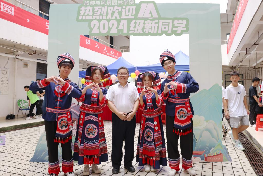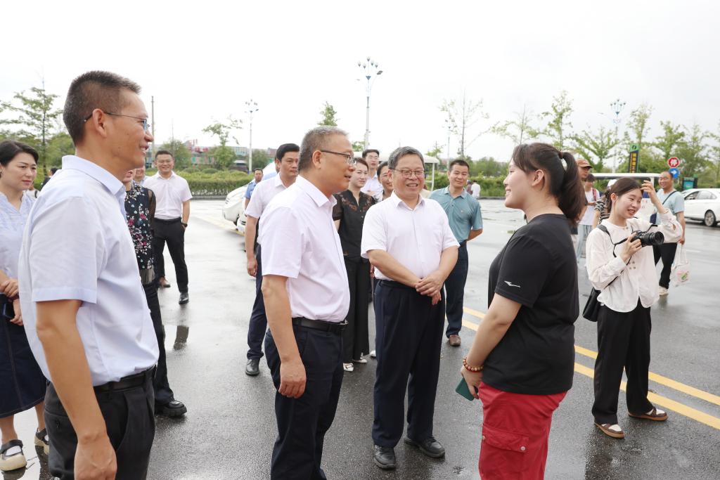 王敦球(左二)、吴志强(左三)在雁山校区东大门与新生亲切交流