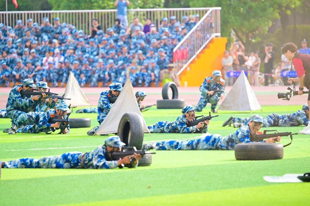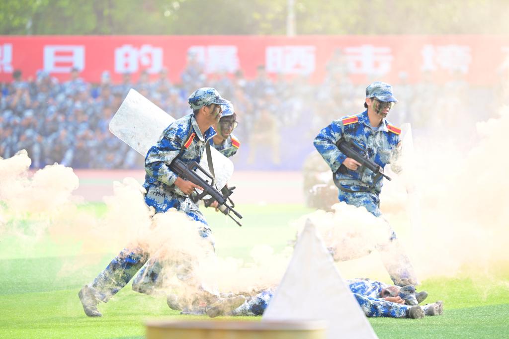 在军事项目展示中,女子匕首操展示,气势如虹、干净利落,一突一刺、一防一击尽显巾帼气势;旗语方队以倒计时的形式来展现桂工学子对中华人民共和国成立75周年无与伦比的自豪与骄傲,队列井然有序,节奏动感明快,舞动的旗帜为训练场增添了一道亮丽的风景;手语操《我爱你中国》演绎了桂工学子真挚的家国情怀,方队成员沉着有力地舞动双手,以无声的语言献礼中华人民共和国成立75周年;男子拳术方队《军体拳》展示威风凛凛、动作矫健,“杀”声响亮、势如霹雳,一招一式彰显桂工学子的英武之气;武术展示环节,一招一式中能感受到桂工学子自强不息的精神,不断砥砺品格、磨练意志、增长本领、强健体魄的决心。战术营救展示中,“新兵”以实战面貌入场,带来紧张刺激的红蓝战术对抗展示,展示了无人装备战术侦查爆破、战术推进、战斗支援、战场救护、人质营救等军事科目,现场“战”味十足、气势恢宏,赢得了师生的阵阵掌声。