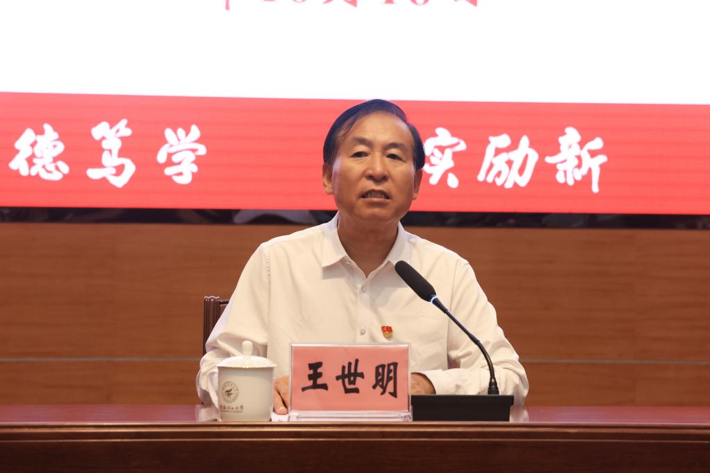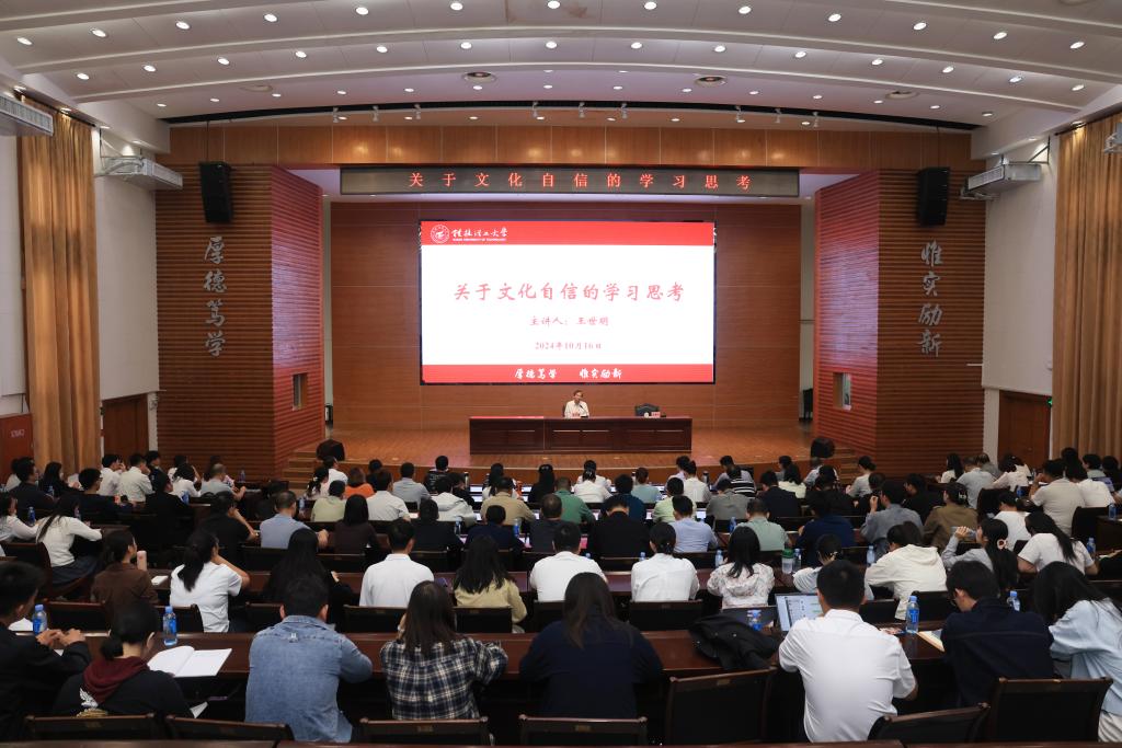 王世明围绕习近平文化思想的深刻内涵,用朴实的语言生动解读“文化自信是更基础、更广泛、更深厚的自信,是一个国家、一个民族发展中最基本、最深沉、最持久的力量”等重要论述,深入浅出地阐释了文化自信的重大意义、重要支撑等方面内容,并用“唯物”“利他”“生生”等关键词凝练了中华优秀传统文化中的中国立场、中国价值和中国追求,分享了对于推动中华优秀传统文化创造性转化和创新性发展的学习与思考。“‘自强不息,厚德载物’‘勤读力耕’就是中国奋斗的最好诠释”“好好干、好好活,好好干就是好好活”“人的命运应由自己主宰,幸福是靠自己奋斗得来的”……王世明勉励师生在深入学习中华优秀传统文化中汲取奋斗精神,塑造中华民族刚柔并济的精神品格,在强国建设、民族复兴新征程上书写壮丽青春篇章。