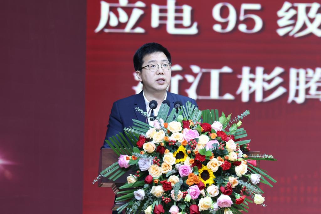 学校应电95级校友、“双百计划”参与者、浙江彬腾科技股份有限公司董事长朱海斌先生作为校友代表发言。他勉励学弟学妹珍惜大学时光,努力学习专业知识,不断提升自己的综合素质;勇于实践,敢于创新,培养创新精神和实践能力;心怀感恩,回馈社会,为祖国的繁荣富强贡献自己的力量。