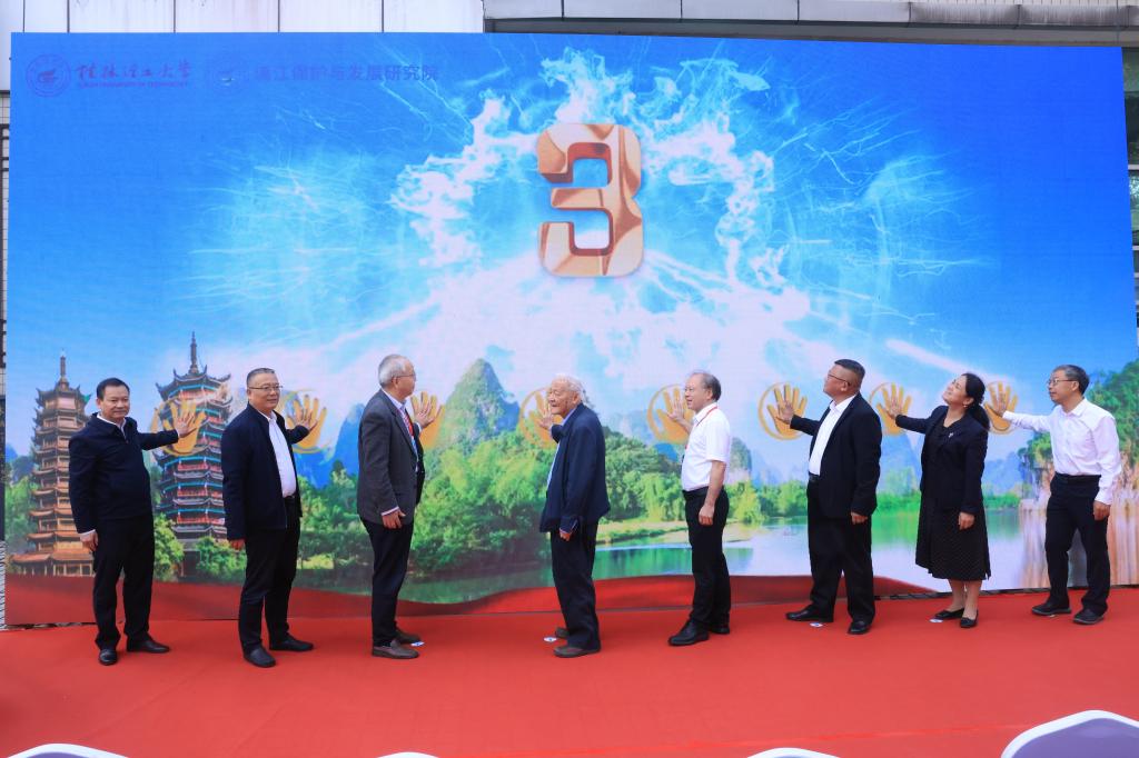 揭牌仪式上,袁道先、王双飞、俞汉青、邓军、王敦球、黄少坚、蒋春华、黎贞崇共同为漓江保护与发展研究院揭牌。