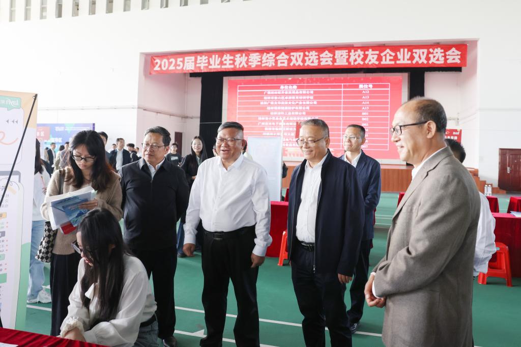 为深入贯彻落实党中央、国务院关于高校毕业生就业工作的决策部署,加强政校企合作,搭建企业人才供需平台,11月10日,beat365在雁山校区体育训练馆举办2025届毕业生综合双选会暨校友企业双选会。学校党委书记邓军,党委副书记、校长王敦球,党委副书记吴志强到现场指导,职能部门相关负责人和二级学院负责人、毕业班辅导员到现场与用人单位洽谈,并悉心指导毕业生求职。