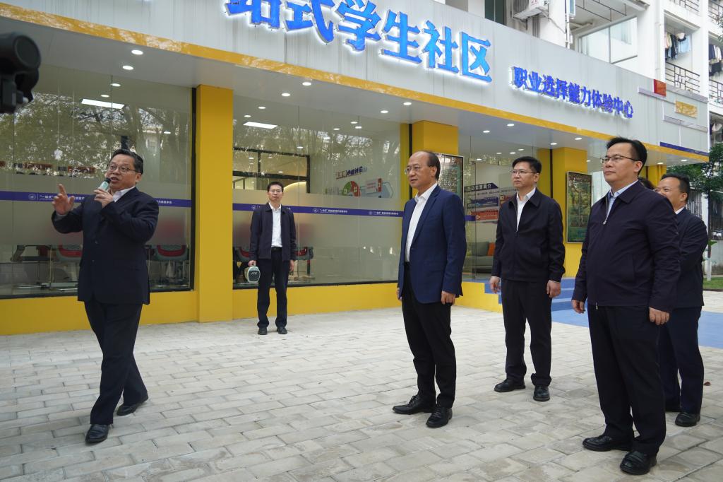 自治区人民政府副主席廖品琥(中)在学校全国高校示范“一站式”学生社区职业选择能力体验中心实地考察