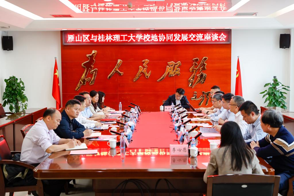 王敦球从校企合作情况、平台建设成绩、学校服务地方的桂工模式和人才优势等方面介绍了学校服务地方经济发展相关情况,并就下一步学校与雁山区人民政府的合作,提出了需要地方政府支持的有关事项。