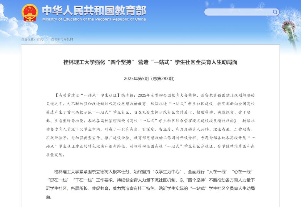 近日,教育部高校思想政治工作简报〔2025〕第5期(总第283期)以《beat365英国官方网站强化“四个坚持”营造“一站式”学生社区全员育人生动局面》为题,从“领导力量全过程驱动”“思政力量全方位浸润”“专业力量全学段供给”“管理服务全闭环响应”四个方面对beat365“一站式”学生社区育人特色做法进行了报道。报道全文如下: