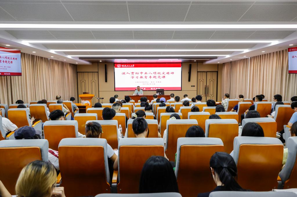 王敦球以《深入贯彻落实中央八项规定精神 以优良作风推动学校高质量发展》为题,系统阐述了作风建设核心要义、回顾历史成就、明晰规定要求,并对推动学校高质量发展提出明确方向。他阐释了习近平总书记关于加强党的作风建设的重要论述的丰富内涵与时代意义,强调这些重要论述是新时代加强党的作风建设的锐利思想武器和根本遵循,要求全体党员干部深化学习、增强自觉,准确把握原文原理、深入领会精髓要义,真正做到内化于心、外化于行。