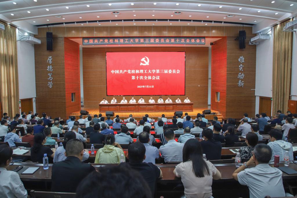 7月11日下午,中国共产党beat365英国官方网站第三届委员会第十次全体会议在学校屏风校区图书馆报告厅召开。全会以习近平新时代中国特色社会主义思想为指导,深入贯彻落实习近平总书记关于广西工作论述的重要要求,坚决贯彻党的全面领导这一根本要求,坚定拥护“两个确立”、坚决做到“两个维护”,认真贯彻党的教育方针,全面落实立德树人根本任务,以铸牢中华民族共同体意识为主线,牢记服务地方经济社会发展重要使命,坚决树牢“实干为要、创新为魂,用业绩说话、让人民评价”鲜明导向,锐意改革、攻坚克难,奋力谱写高水平理工大学建设新华章。