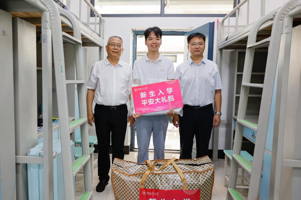 在学生宿舍,校领导与新生亲切交流,关心大家入学后的适应情况与生活需求,并赠送了平安大礼包、爱心大礼包和学习用品,鼓励同学们尽快融入新环境、合理规划大学生活、保持积极心态、勇于探索创新,在桂工度过充实而美好的求学时光。