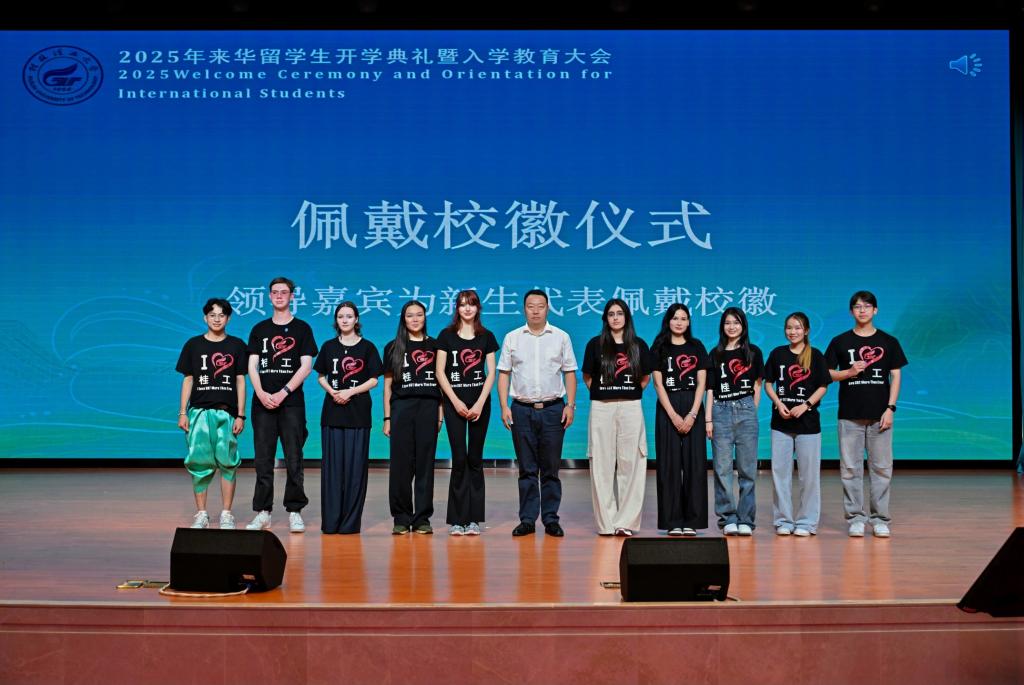 会上,罗盛锋为新生代表佩戴校徽,来自15个国家的520余名新生正式成为桂工大家庭中的一员。