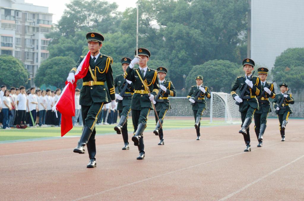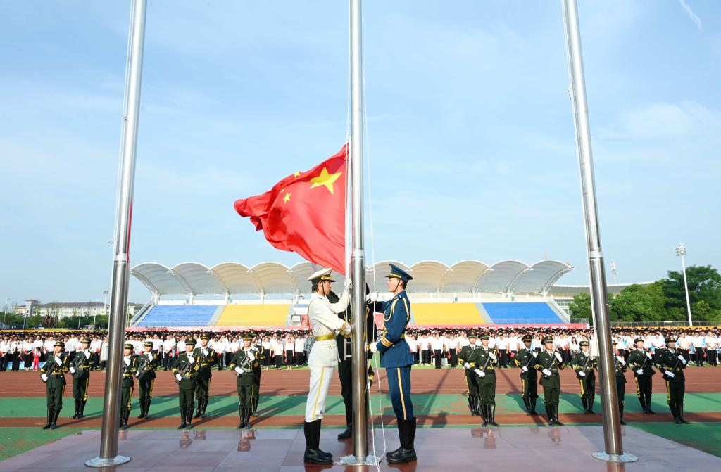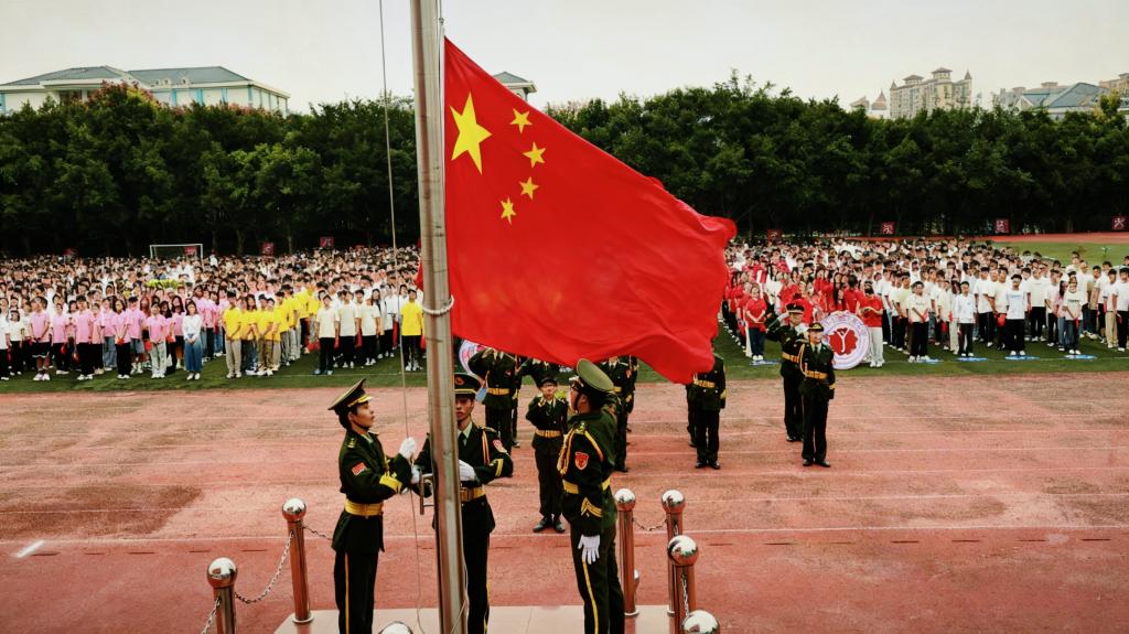 迎着初升的朝阳,国旗护卫队队员迈着铿锵的步伐护送五星红旗走向升旗台。五星红旗冉冉升起,在场师生一同唱响国歌,并行注目礼,表达对祖国的深切祝福与崇高敬意。