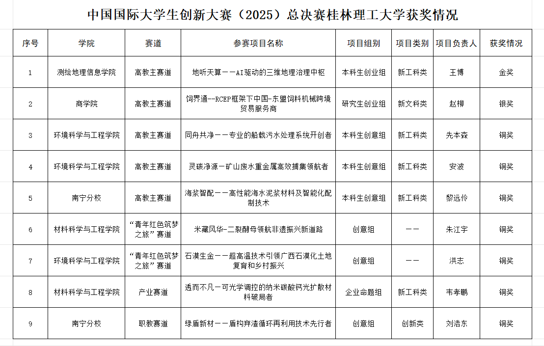 本届大赛启动以来,学校高度重视备赛工作,校党委书记农毅靠前指挥、部署推动相关工作,校长王敦球多次深入指导集训及赛前动员,副校长王磊率队出征全国总决赛。本科生院、研究生院、科研院、校团委(创新创业学院)及二级学院精心组织、协同推进,压紧压实赛前培训,强化细化赛事服务,师生团队夜以继日、精益求精、全力以赴拼搏备赛,充分诠释了“艰苦奋斗、敬业奉献、团结协作、开拓创新”的桂工精神。