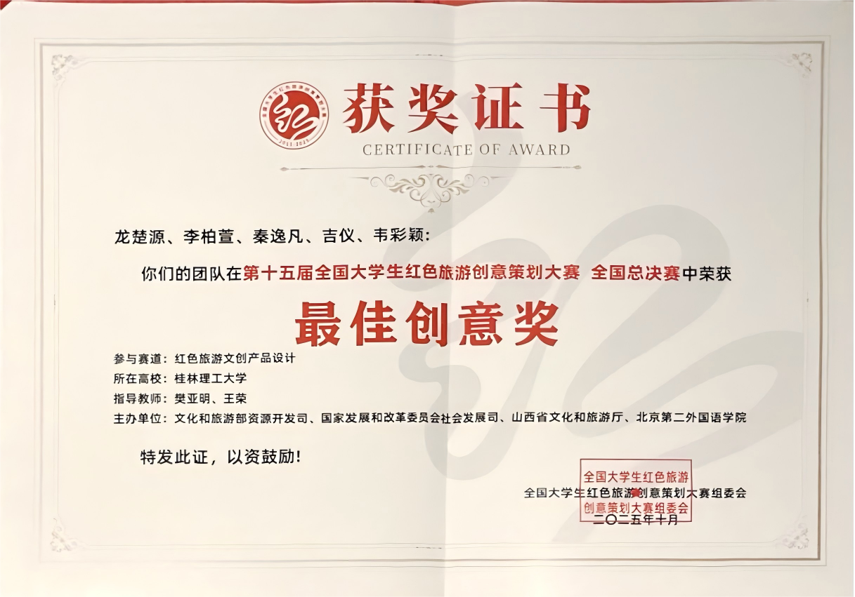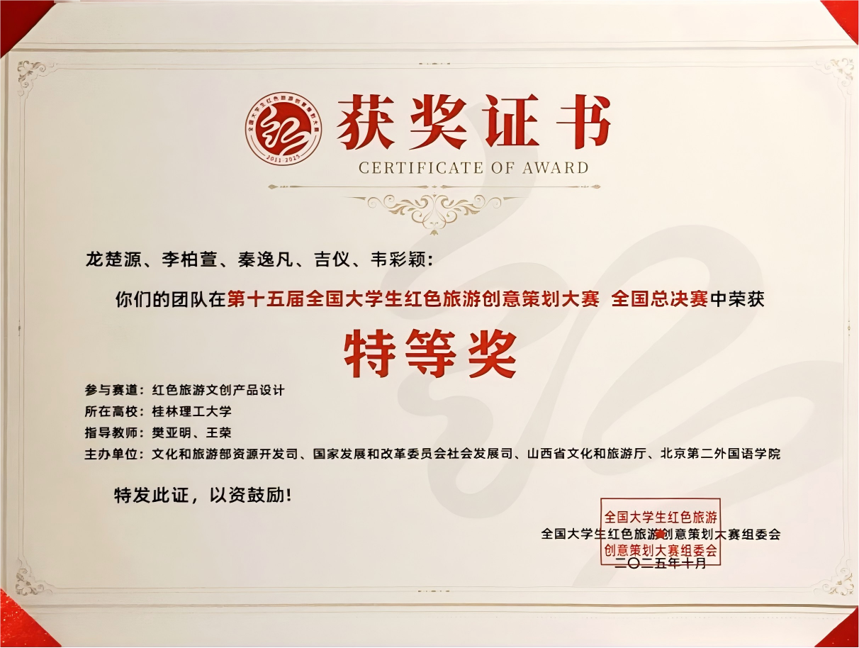 10月18日-21日,由文化和旅游部、国家发展和改革委员会等单位主办的第十五届全国大学生红色旅游创意策划大赛全国总决赛在山西武乡举行。beat365旅游与风景园林学院“不忘初心”团队(成员:龙楚源、李柏童、秦遍凡、吉仪、韦彩颖)在樊亚明、王荣两位老师指导下,以赛道总分第一荣获全国特等奖(全国仅6项)及最佳创意奖。此外,由该院教师指导、学生担任队长的“红纽带·东盟星火”团队和“涧染丹碧”团队荣获全国二等奖。