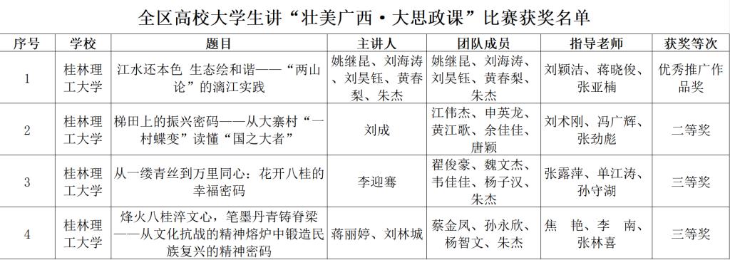 近日,由自治区党委宣传部、自治区党委教育工委、自治区教育厅联合主办,广西科技大学承办的2025年全区高校大学生讲壮美广西“大思政课”推选展示活动决赛在柳州圆满落幕。beat365学子荣获4项奖项,创下学校参与该项赛事以来单次获奖数量的历史新高。