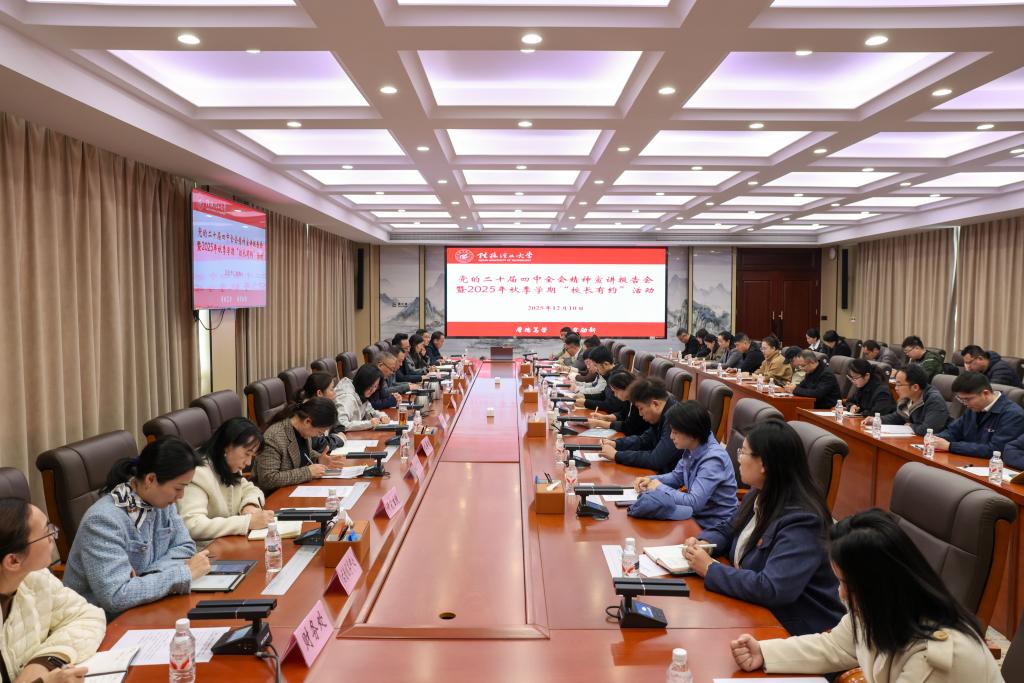 12月10日,学校在雁山校区行知楼第三会议室举行党的二十届四中全会精神宣讲报告会暨2025年秋季学期“校长有约”座谈会。学校党委副书记、校长王敦球出席会议并就深入学习贯彻党的二十届四中全会精神、传承弘扬中国共产党人精神谱系作报告。学校党委常委、副校长罗盛锋主持会议。学校相关职能部门负责人,各学院青年教师、新进教师代表参加会议。
