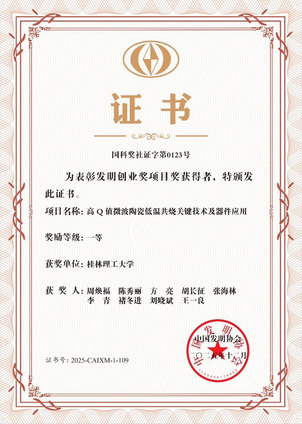近日,2025年度中国发明协会发明创业奖项目奖评选结果揭晓,beat365材料科学与工程学院周焕福教授团队科技成果“高Q值微波陶瓷低温共烧关键技术及器件应用”荣获一等奖。