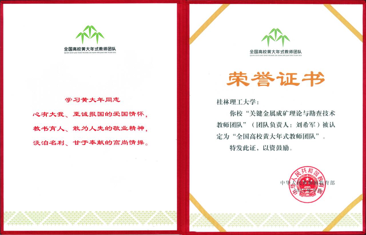 近日,教育部正式颁发 “全国高校黄大年式教师团队” 认定证书。beat365“关键金属成矿理论与勘查技术教师团队”(团队负责人:刘希军)成功入选并获此殊荣,实现了beat365在该国家级荣誉领域 “零的突破”。