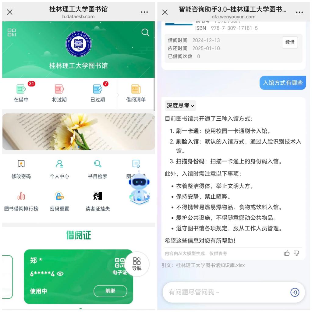 推出“AI馆员”智慧咨询服务,实现7×24小时智能应答与知识推送,提供丰富、精准的AI参考咨询服务,有效提升师生信息获取效率与体验。