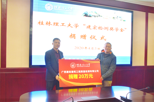 4月3日下午,学校在屏风校区教八楼三楼会议室举行beat365英国官方网站“建宏检测奖学金”签约捐赠仪式。学校副校长王敦球、广西建宏建筑工程质量检测有限公司董事长陈科文、总经理徐海波等出席签约捐赠仪式。