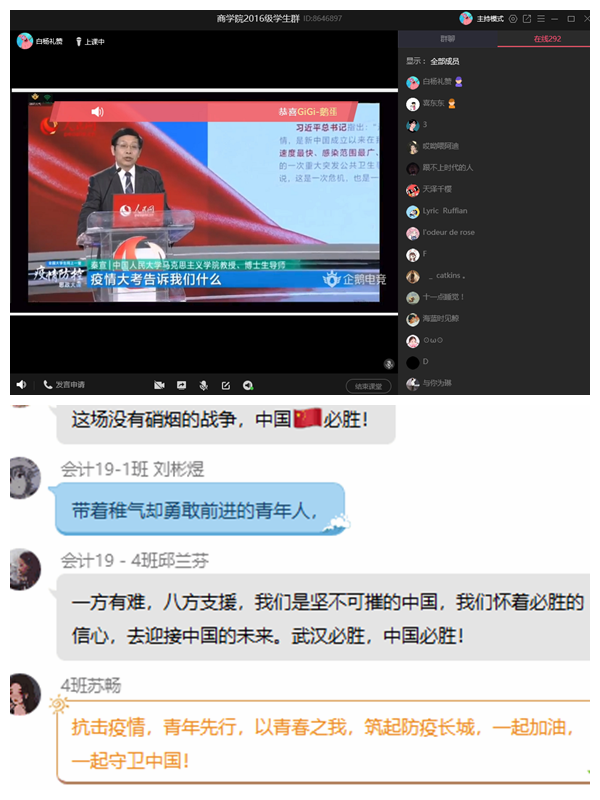 课程结束后,思政课教师组织学生们进行了在线讨论。同学们纷纷表达了此次学习的感受与体会。他们表示,通过学习这一堂思政课的内容,进一步全面认识到中国抗疫彰显的中国共产党领导和中国特色社会主义制度的显著优势,也更加深刻认识到作为新时代青年在民族伟大复兴中的责任与担当。作为新时代的青年,一定要将个人发展与民族未来、国家前途紧密结合起来,不断增强自身本领,努力奋斗,把梦想变为理想,将理想落实为活生生的现实,为国家富强奉献青春和力量。