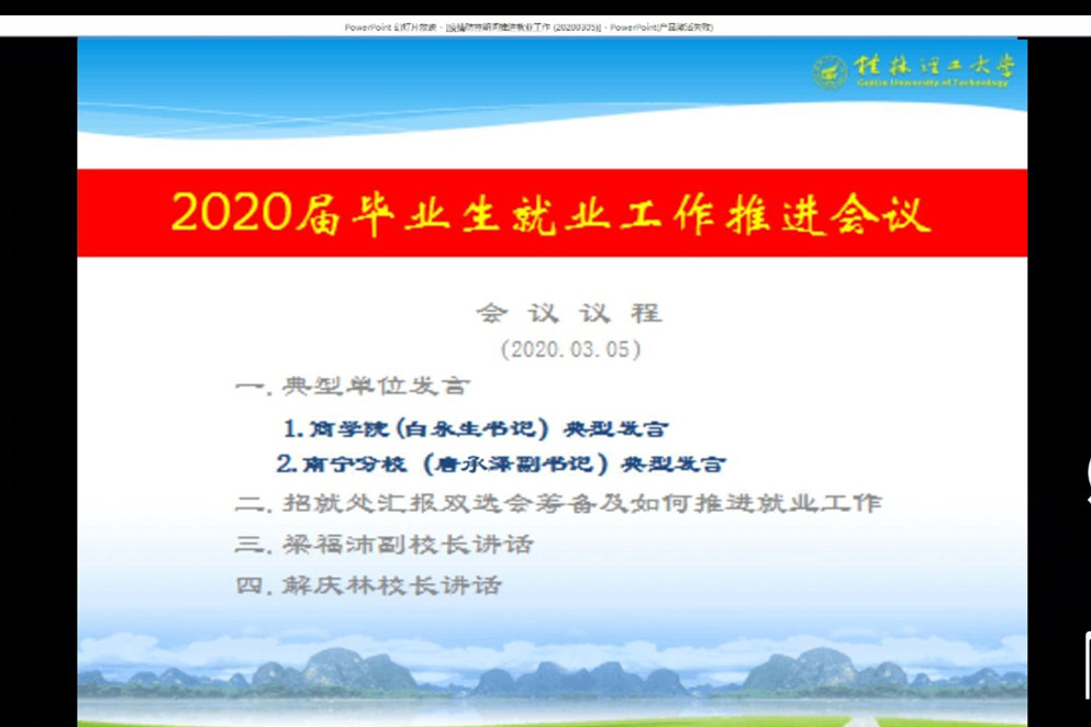 会上,商学院、南宁分校相关负责人分别就2020届毕业生就业工作工作情况做了典型发言;招生就业处相关负责人对毕业生签约(提交协议)情况、摸底调查2020届毕业生就业情况、近期就业工作开展情况及下一阶段就业工作方案和2020年春季线上双选会组织筹备做了汇报。