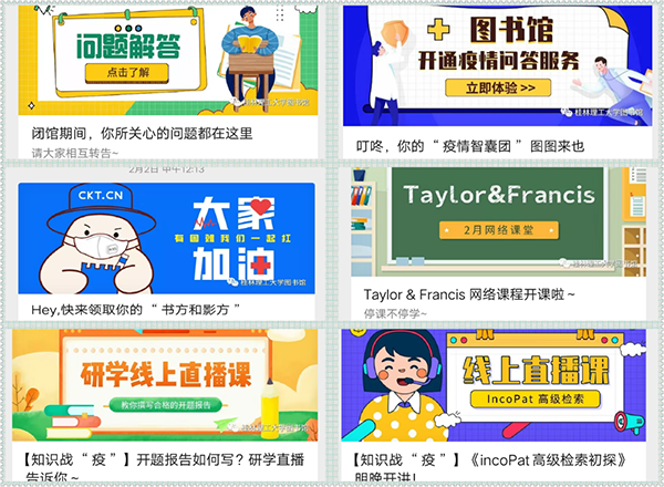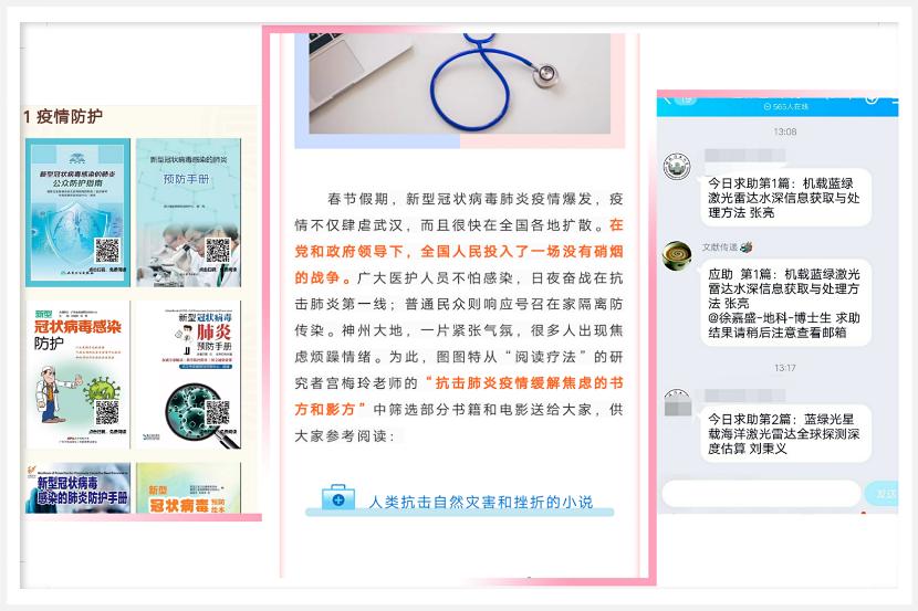疫情防控期间,为了丰富广大师生的精神文化生活,满足大家“足不出户”,依旧能“博览群书”的需求,图书馆积极开展线上阅读服务,利用微信公众平台推出多期“御寒小书单”,新冠病毒及疫情防范的科普电子书籍等。同时,为疏导部分读者面对疫情焦虑不安的情绪,针对性地推出“抗击肺炎疫情缓解焦虑的书方和影方”,为读者筑起心理防线。