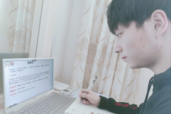 商学院电商专业17-2班的汤玉昆为了能够更快地融入新的上课模式,他早早查阅了资料、观看课件、熟悉网课软件操作等等,满腔热情。他希望能够尽快回到校园与老师们面对面解答疑惑,享受与同学们一起讨论的氛围。他表示疫情当下,作为新时代的青年大学生,我们不能停下手中学习的笔杆,不能停下思考运转的大脑,更不能让疫情浇灭了学习的热情,充实的生活才能让他在家更好地提升自我。