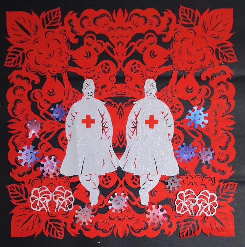 学校闵江红老师的剪纸作品《逆行者》