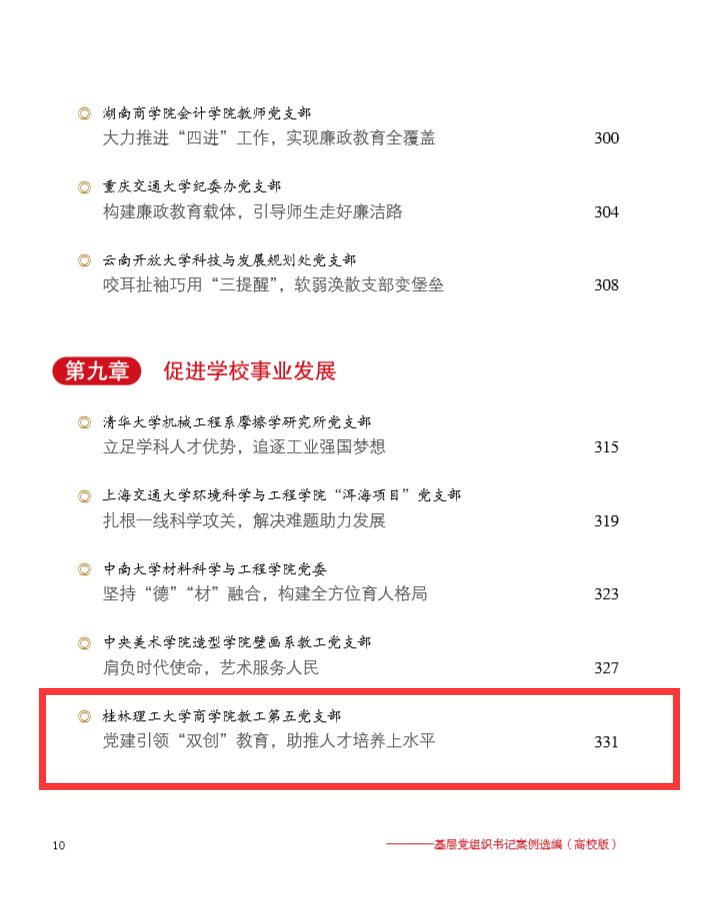 近日,由中央组织部党员教育中心、教育部思想政治工作司组织编写的《基层党组织书记案例选编(高校版)》正式出版,beat365选送的以商学院党委房产教工党支部书记马小龙同志事迹为素材编写的题为《党建引领“双创”教育,助推人才培养上水平》的案例正式入选,是广西唯一有案例入选的高校。