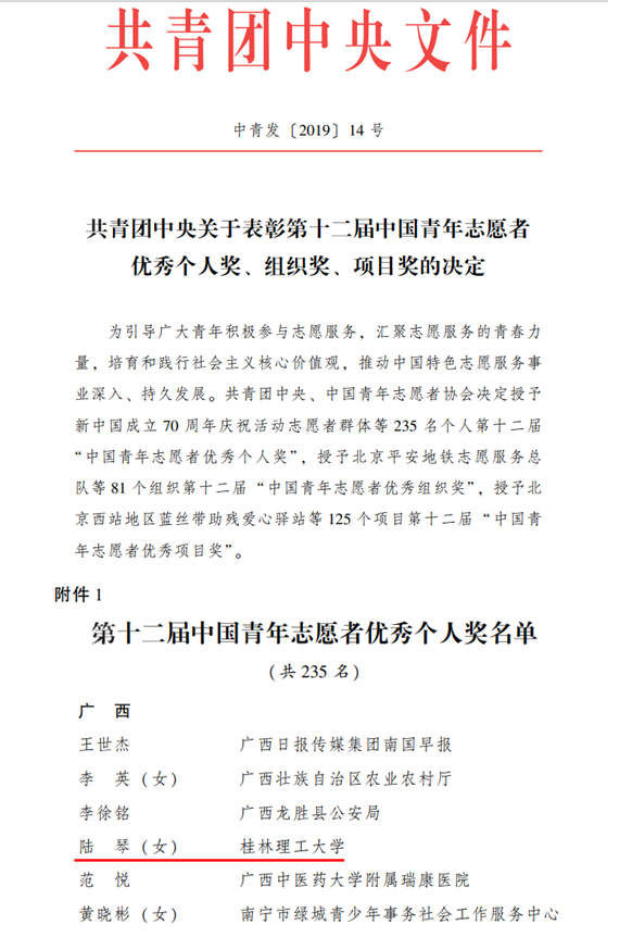 近日,由共青团中央、中国青年志愿者协会共同举办的“第十二届中国青年志愿者优秀个人奖、组织奖、项目奖”评选活动结果揭晓,beat365环境科学与工程学院团委副书记(主持工作)陆琴入选,获评为“第十二届中国青年志愿者优秀个人”荣誉称号。