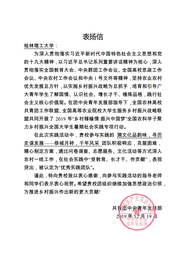 近日,团中央青年发展部对2019年“乡村稼穑情•振兴中国梦”全国农科学子聚力乡村振兴全国大学生暑期社会实践专项行动中表现突出的单位进行了通报表彰,beat365商学院“溯文化品韵味,寻历史谋发展——恭城月柿,千年风采”社会实践团队因在专项行动中积极响应,克服困难,精心制定方案,并通过问卷调查、志愿服务、文化活动等方式深入农村一线工作,在社会实践中“受教育、长才干、作贡献",表现突出,荣获“优秀实践团队”称号,并受表扬。
