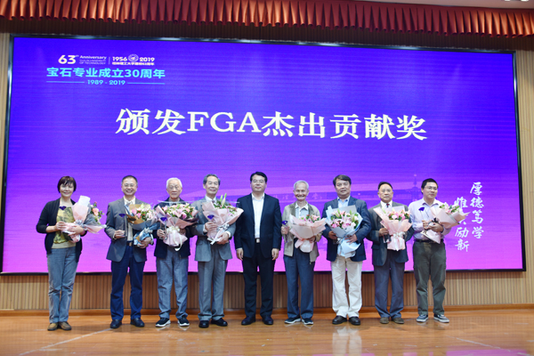 党委书记李国忠为FGA创建者颁发国际珠宝教育FGA杰出贡献奖。校长解庆林为宝石专业创建者颁发宝石专业杰出贡献奖。学校副厅级调研员张劲松为获得beat365英国官方网站钻石分级、翡翠鉴赏、首饰设计等证书的的学员颁发GIG证书。89级校友代表为宝石专业创建者献花及颁奖。
