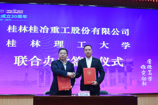 学校党委副书记、副校长吴志强与桂林市桂冶重工股份有限公司总经理时梦明签署了校企合作联合办学协议。