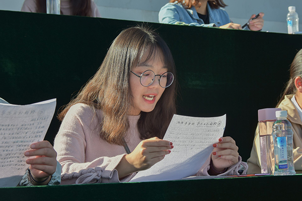 公共管理与传媒学院的刘昕瑀同学是本次校运会上的一名播音员,她的主要工作是播加油稿。在播音之前,她会认真进行前期准备工作,希望以最好的状态投入到工作中。是她们饱含激情的加油将运动会的氛围推向一个又一个高潮,是她们热情洋溢的声音使场上的运动健儿更加斗志昂扬。